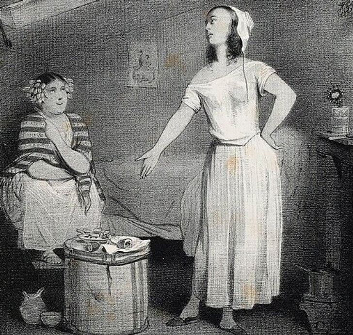 2 pouches were sewn to the undershirt, which could be adjusted with straps. Ladies put on this shirt in the morning, then placed their breasts in the pouches and tightened the straps. Some ladies managed to lift the bust to attract the attention of the opposite sex, which was considered the ultimate obscenity. In contrast, those who had large breasts used very tight pouches to conceal the size.