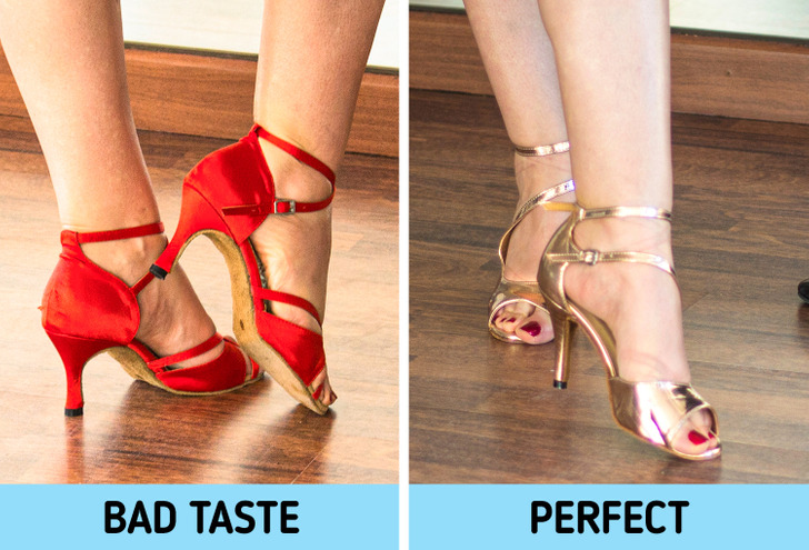 If the shoes show contrast with the skin color, people will watch the legs. This is why women choose nude, cream, gold, or silver shoes. These are better than very bright or very dark colors. And men prefer black shoes to match their pants.