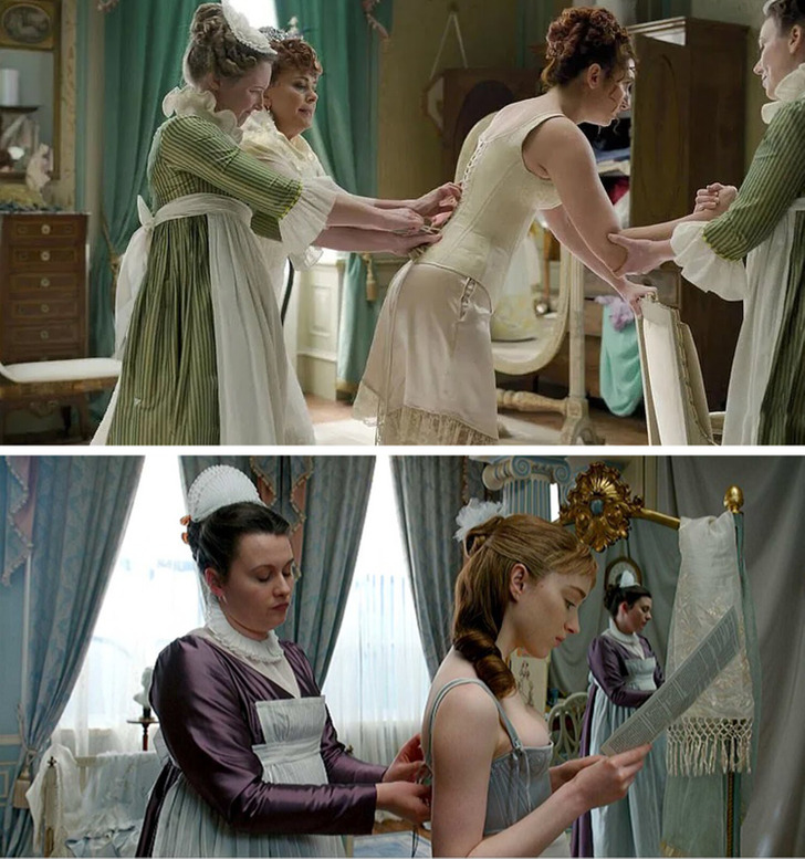 In the TV series Bridgerton, the heroines are shown wearing tight corsets directly against their bare skin. We even see cuts and scratches on Daphne Bridgerton’s back, supposedly caused by the discomfort of the corset. However, in reality, this would have been impossible. During the Regency period, as in other historical eras, corsets were worn over an undergarment, which was an essential part of every lady’s wardrobe.