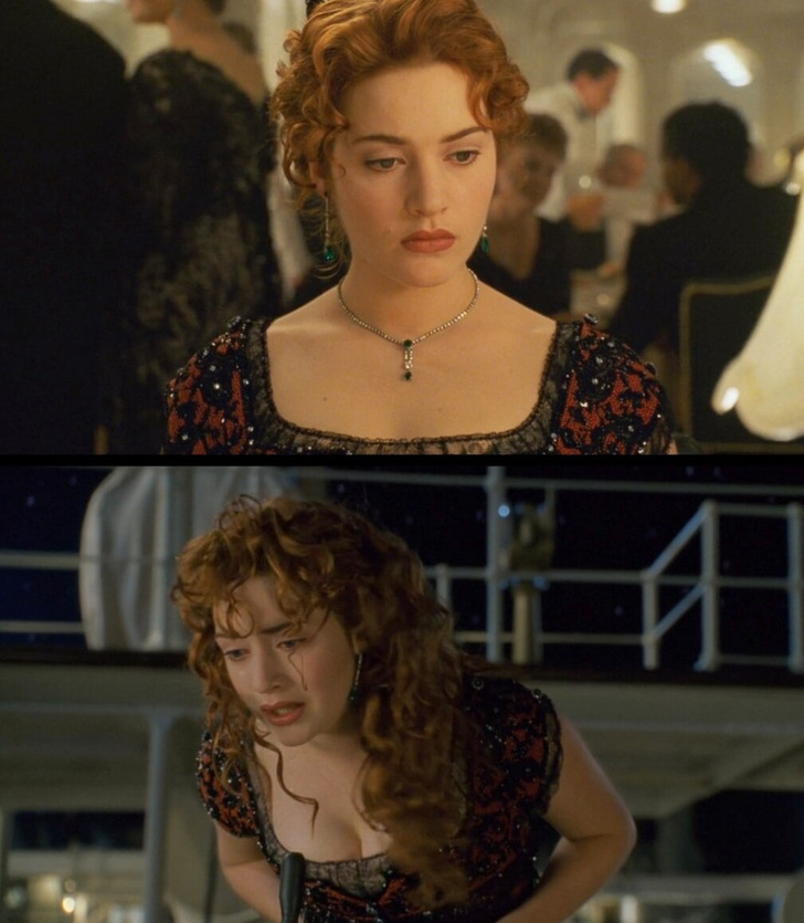 In the scene where Rose is quietly contemplating her unhappy future over dinner, she’s wearing a diamond necklace. But in the next scene, when she runs onto the deck, the necklace is gone, and her hair is suddenly disheveled.