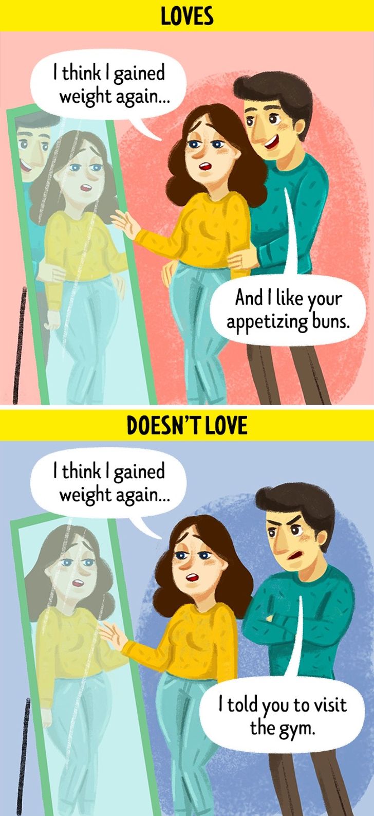 Omar Khayyam said, “A person will like everything, even the flaws, of their beloved, but will be annoyed at the perfection of those whom he does not love.” For a truly loving man, you are always beautiful, even with messy hair and even in your oversized nightgown. He will not notice that you have gained a couple of extra pounds after the winter holidays if you do not say it yourself. But if your man constantly tells you to go to the gym or hints that you need plastic surgery, do not rush to indulge him. It is most likely that it’s not your appearance that doesn’t suit him, but you yourself. And even if you lose weight, he will find other faults in you.