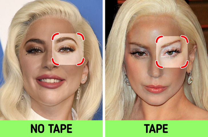 Lady Gaga is a big fan of wigs. They not only protect her hair from too much trauma, but they also help her change her eye shape. She said she used tape to fix the wigs and lift her skin when needed. You can notice it in photos from the 2014 Vanity Fair party.
