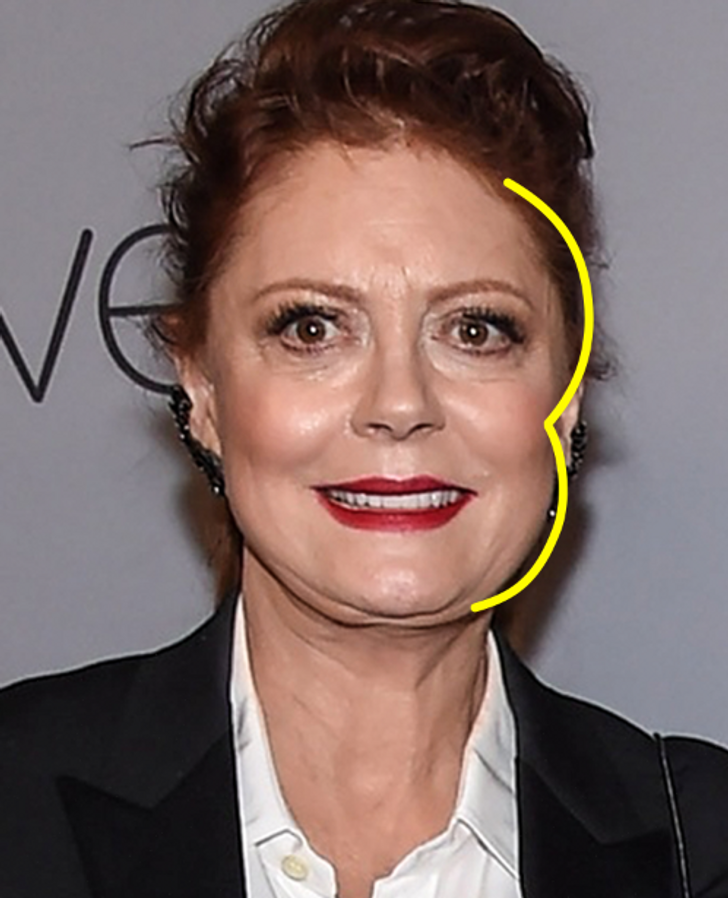Susan Sarandon looks stunning in her 70s. And her secret is effortless. Her artist, Tim Quinn, sculpts her face with a little trick: he puts on the bronzer starting from the forehead, touching the cheekbones, and going down to the chin.