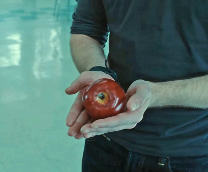 In the first film of the franchise, Bella accidentally drops an apple in the school canteen. When Edward catches it, he holds the fruit in his palms, copying the cover of the novel of the same name on which the film is based.
