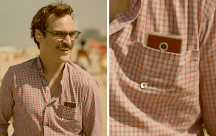 On his date with the artificial intelligence in Her, Theodore fastens his shirt pocket with a safety pin to avoid blocking Samantha’s camera, allowing her to see everything as the evening unfolds.