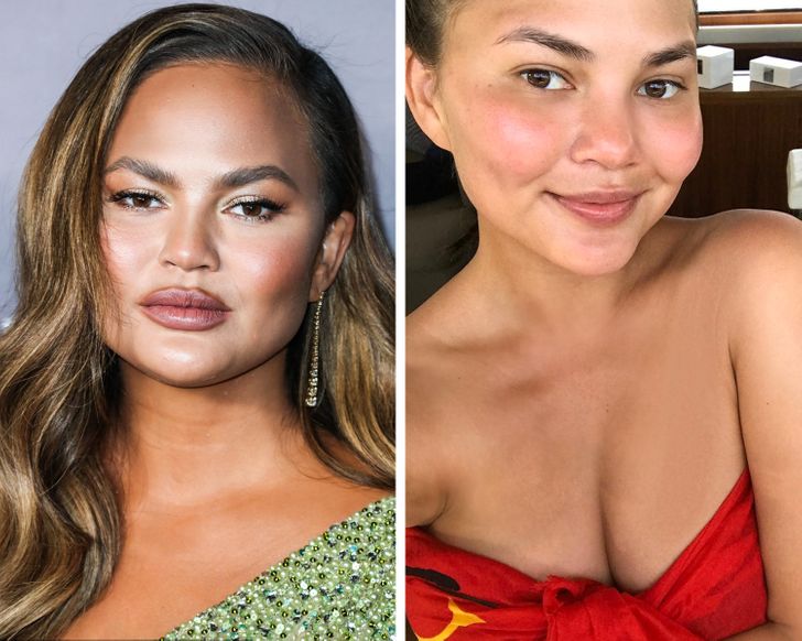 The right photo was posted by John Legend (Chrissy’s husband) himself with the caption, “No filter necessary.” However, Teigen never feels shy about showing her real self to her audience. She has even posted a makeup-free video talking about how her skin changes during periods.
