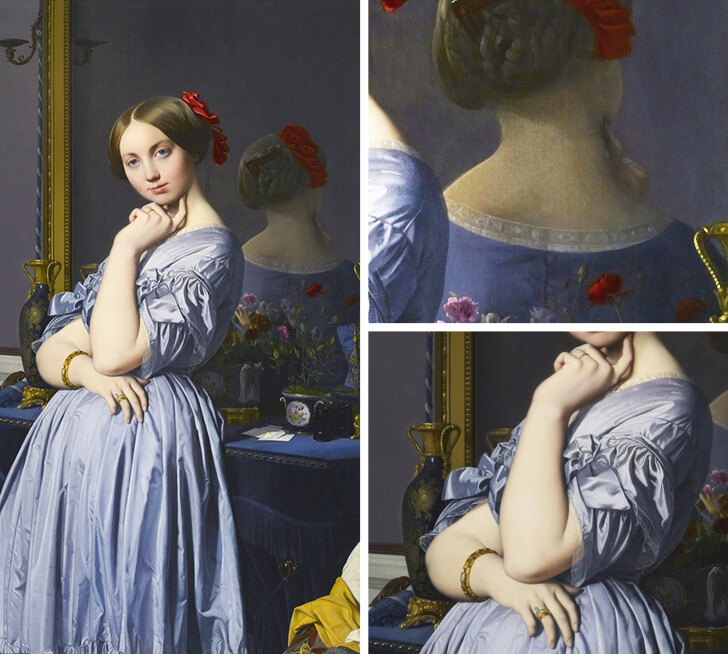 Ingres never let anatomy constrain the fluidity of his portraits. At first glance, Comtesse d’Haussonville exudes hyperrealistic precision — so much so that viewers are often astonished it was painted by hand. But a closer look reveals impossibilities. Most striking is her right arm, which crosses her waist at an impossibly low angle, seemingly emerging from the middle of her body rather than connecting to her shoulder.