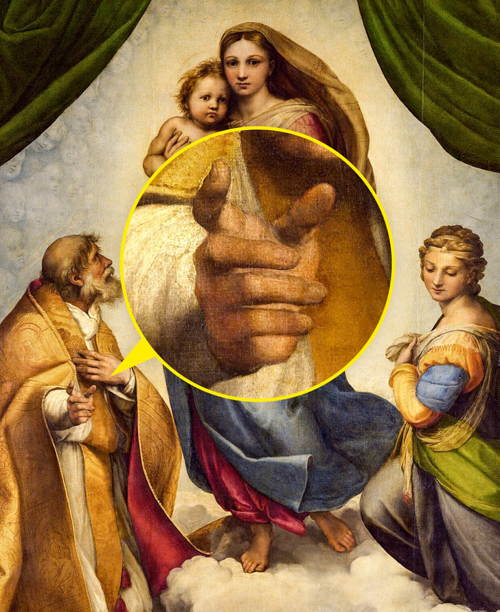 Some art connoisseurs even managed to build a whole theory on this small detail. However, art historian Andrey Zimoglyadov notes that the extra finger is just a piece of the palm, and there is nothing unnatural in the hand of St. Sixtus. It’s just a bad angle.