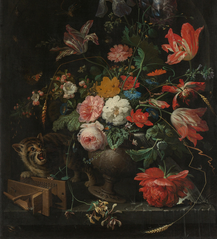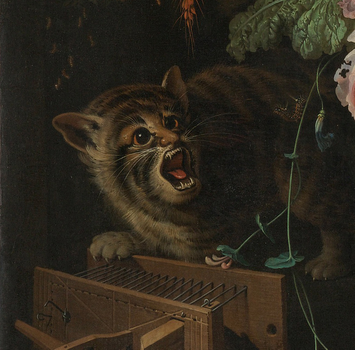 In his painting, the artist was able to depict flowers and insects in a surprisingly naturalistic way. But the poor kitty came out a bit frightening. Art historian Rachel Gould generally believes that the animal has bat ears, a human nose and a mouth that looks more like one of a monkey.