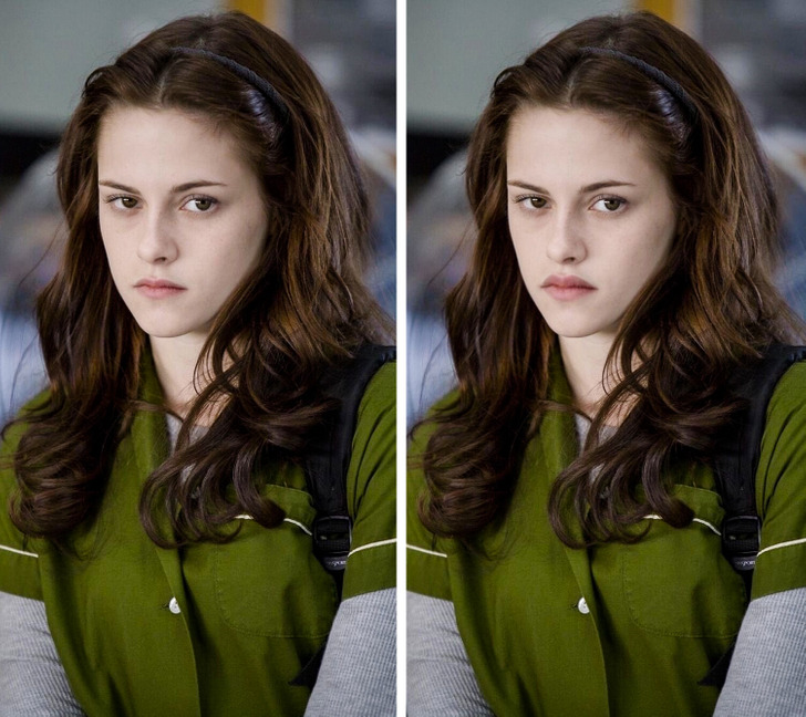 Although Kristen Stewart captures much of Bella’s essence, the book describes the character a bit differently. Bella’s lips are said to be “a little out of proportion, a bit too full for her jawline,” and she has striking cheekbones, long, straight dark-brown hair, and a narrow, pointed jawline. Her eyebrows are darker and straighter than her hair. Stephenie Meyer also repeatedly notes that Bella never wears makeup and that her hair has a faint reddish hue visible only in the sunlight.