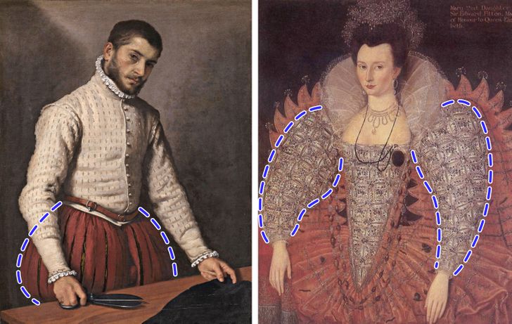The upper classes of the 16th century went absolutely feral with bombasting. Bombast was a mixed form of stuffing that went everywhere — arms, legs, shoulders, and even bellies, to make these body parts seem larger. In extreme cases, people would carry around 6 pounds of this stuff inside their clothes.