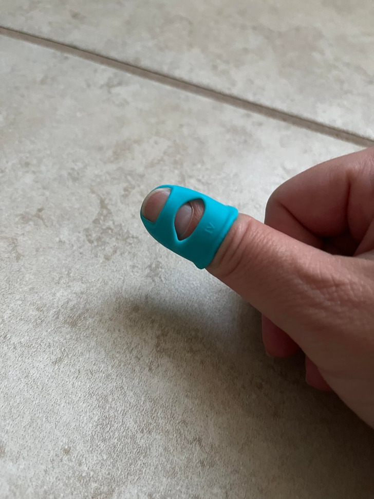 Answer: It’s for flipping through a stack of papers quickly without wetting your finger. It goes on your index finger not your thumb.