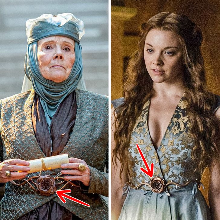 Also, the costumes showed the connection between the characters. Let’s look closer at the women of the Tyrell house. Margaery’s outfits have a lot in common with her grandmother Olenna’s dresses. Even their belts are almost identical. It’s just that Olenna has more spikes and stems because she is the head of the family.