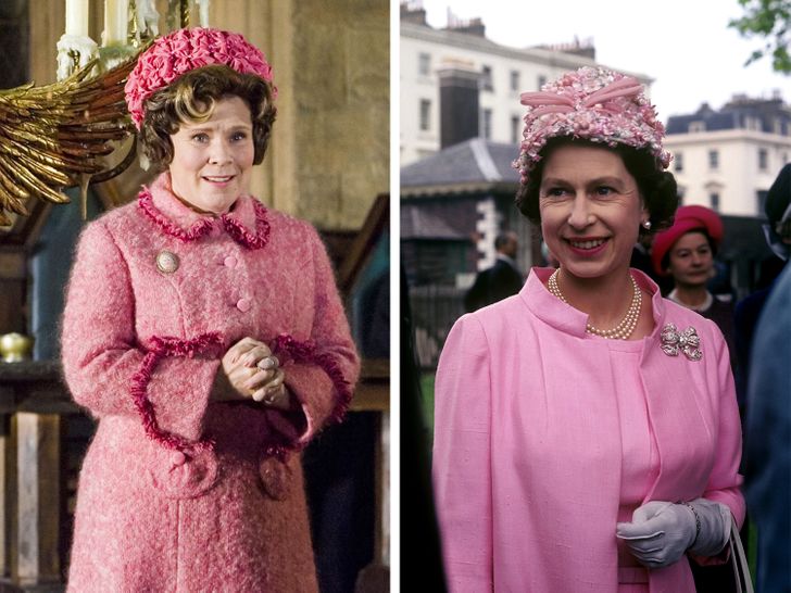 Smart internet users noticed that the pink wardrobe of Dolores Umbridge was pretty similar to the style of Queen Elizabeth. We don’t know whether costume designers did this intentionally, but this detail perfectly unfolds the character of the woman. Despotic Umbridge feels like a true queen at Hogwarts because she can do whatever she wants.