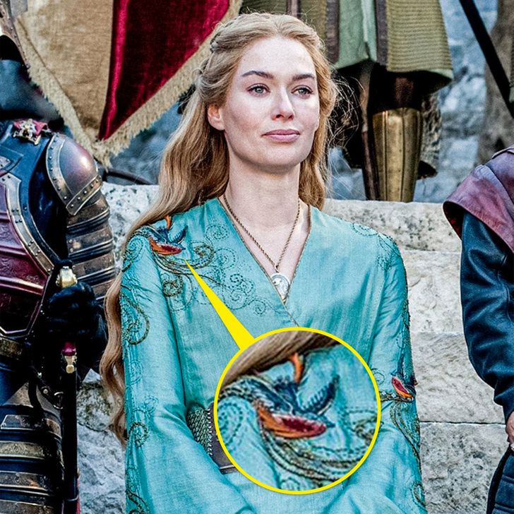 According to the costume designer, the embroidery reflected her true situation, “She is a beautiful woman with a hidden desire for power and a wish to be regarded as an equal in the male-dominated world she inhabits. At that stage, she lives in the shadow of her husband, King Robert Baratheon, who holds power over her and the kingdom.” Also, according to the designer’s idea, this bird is a reference to the twittering and scheming she is involved in behind the scenes.