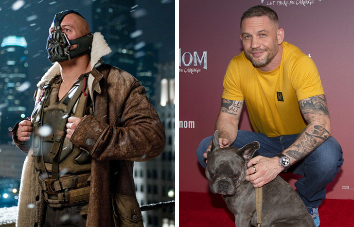 The havoc-inducing, fearmongering Bane in The Dark Knight Rises seems very far off from the real Tom Hardy, who brought his dog Blue to a screening of his movie.