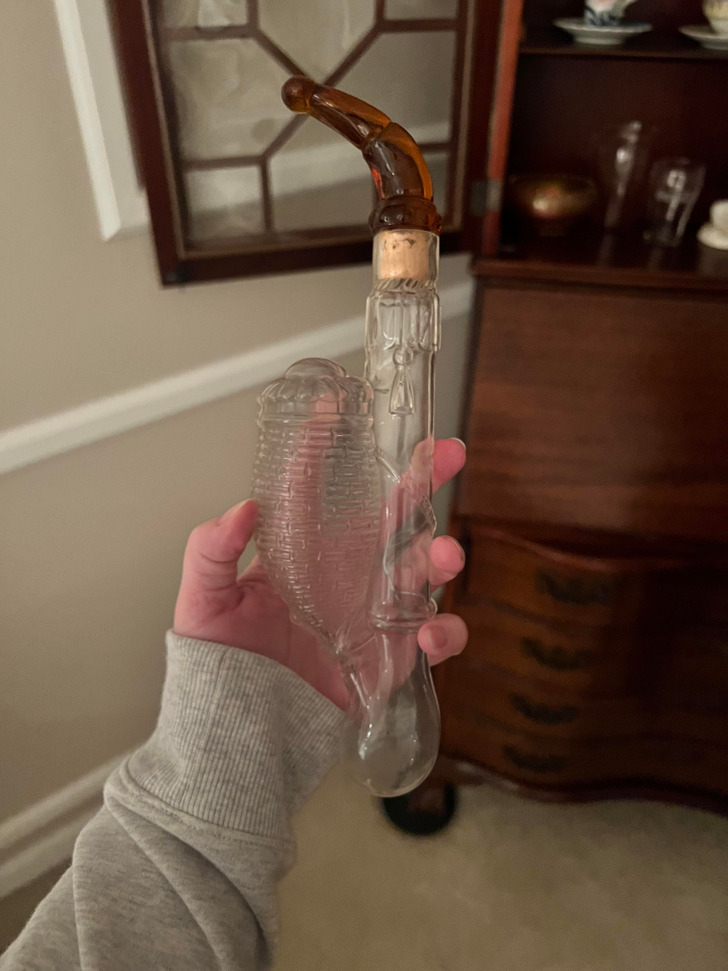 Answer: It’s a glass candy jar in the shape of a pipe. They made them in all kinds of shapes back then. The company is Findlay.