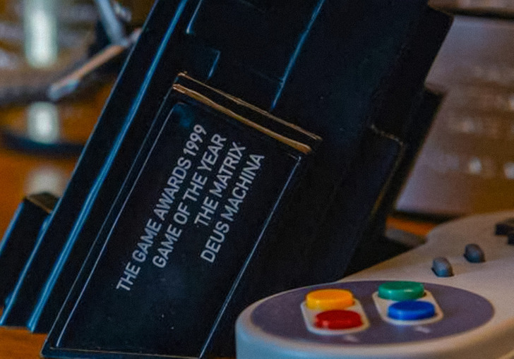 It says it was given for The Matrix video game, made by Deus Machina, a company that Keanu Reeves owns. It was given in 1999, when the first film was released. So, the creators pose a question of what is real in this film and what is not.
