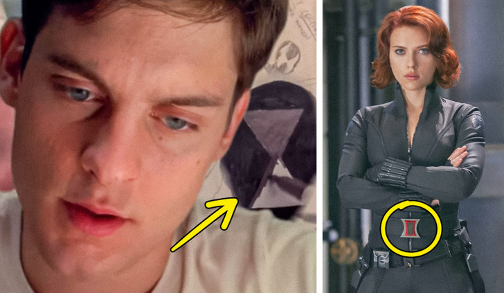 In the 2002 Spider-Man, the character played by Tobey Maguire explores ideas for what his costume will look like and what symbol he will use. One of the options that Peter Parker rejected was the Black Widow’s emblem, another Marvel Comics character: the red hourglass, slightly modified in the movies but still recognizable.