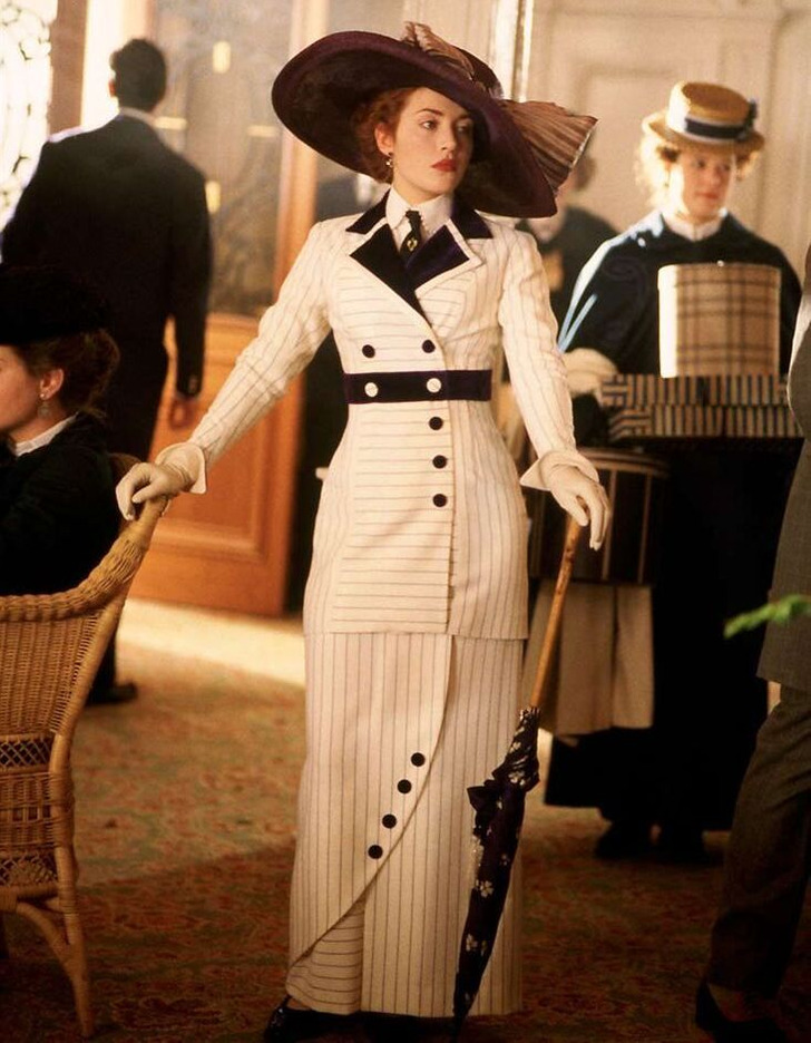 At the start of the film, Rose’s hairstyles and outfits are formal and restrained. Her first look, with its alternating black-and-white stripes, even resembles a prison uniform — a visual symbol of her confined life. But as she falls in love with Jack, her hair and clothing gradually become lighter and freer, reflecting her growing sense of liberation.