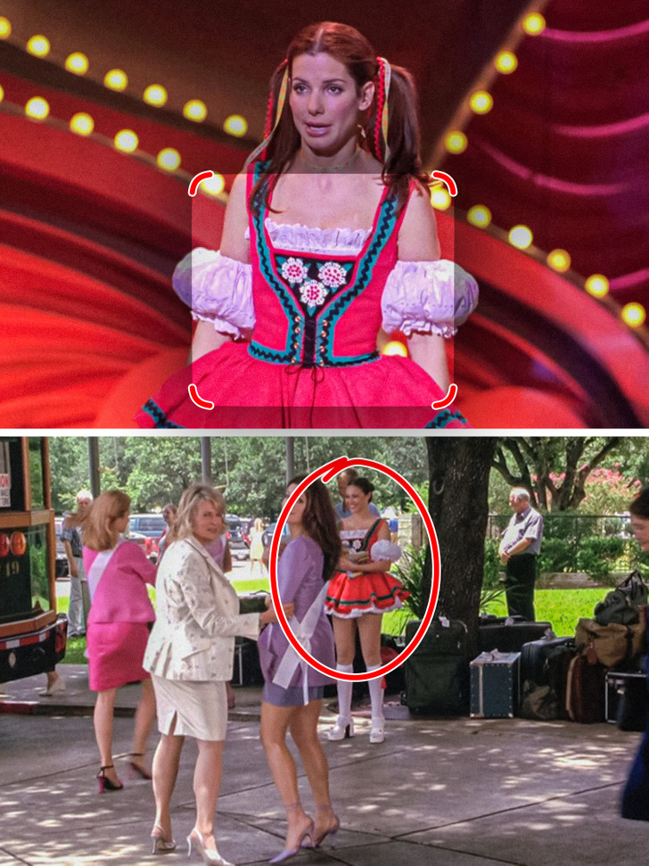 The colorful dress worn by the main character of Miss Congeniality was hard to forget, because it looked very funny on agent Gracie Hart. But very few people noticed where the idea to dress an FBI agent like this came from. The character had too little time to come up with a costume, so they just reused the dress from the girl who was giving out the leaflets at the entrance.
