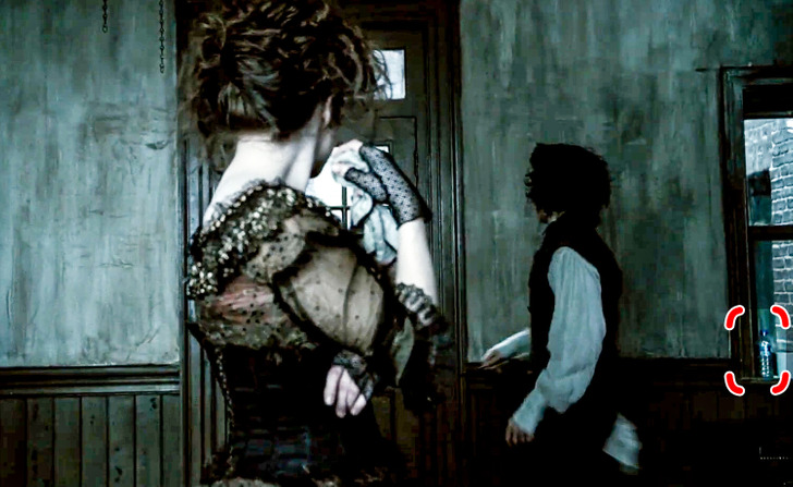At some point, we can clearly see Jack’s suspenders; in the next shot, when his beloved is about to release him, these are gone. The same thing happens several times in other scenes. Perhaps it would have been simpler not to include the suspenders in the costumes at all.