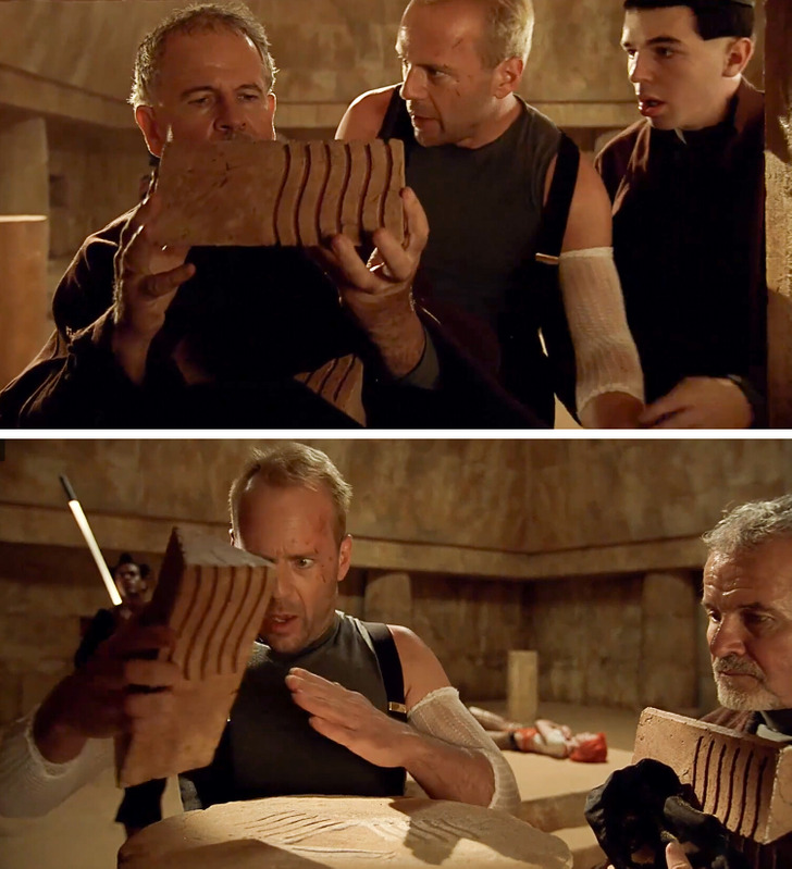 In one of the final scenes, Korben (Bruce Willis) snatches the water stone from Cornelius (Ian Holm). As he approaches the column, the stone magically changes its symbol and turns into a fire stone, and the water stone is back in Cornelius’ hands.