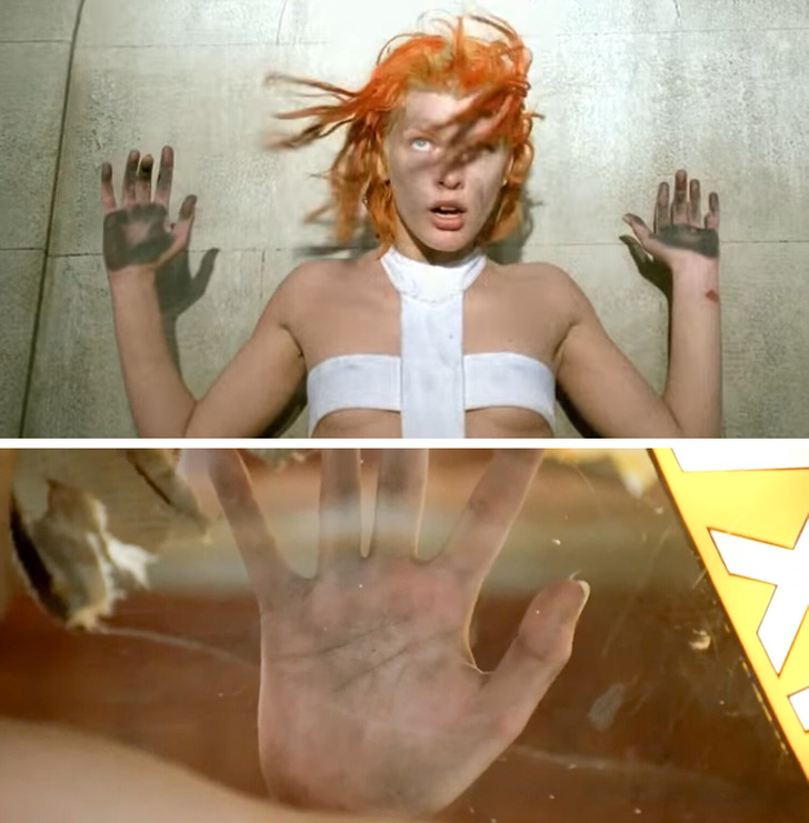 In the scene that follows the trip through the ventilation system, you can see that Leeloo’s palms are literally black with dirt. However, after a very successful jump and flying straight through the roof of the taxi, she manages to clean them somehow.