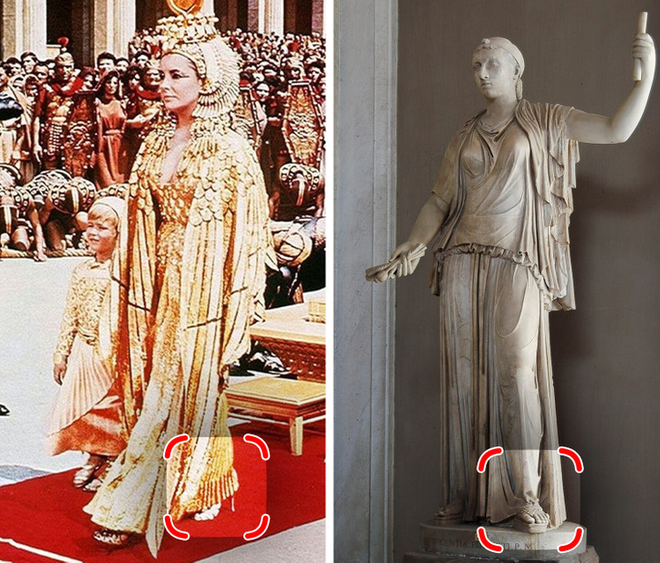 In the historical movie, Cleopatra very often appears wearing modern stiletto shoes. And sometimes, for greater “authenticity,” the queen still wears quite normal for those times sandals, which in the next frame again turn into more glamorous shoes.