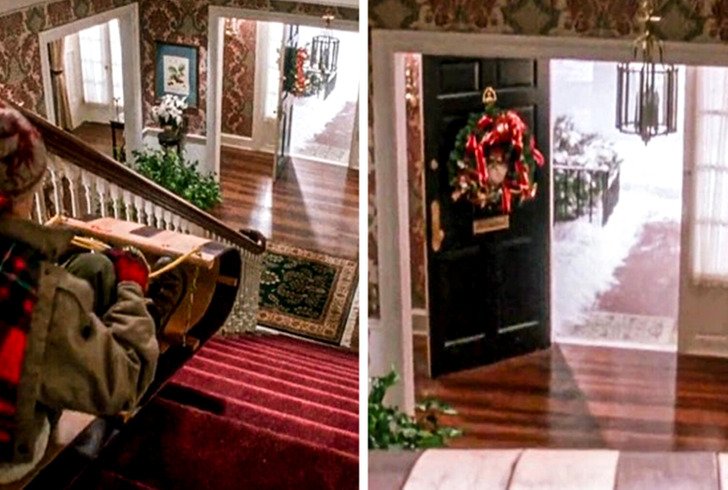 In the classic movie Home Alone, when Kevin is about to sled down the stairs, the front door is first seen ajar. In the next shot, it’s already wide open. They probably just recorded everything at different times and got a little confused.