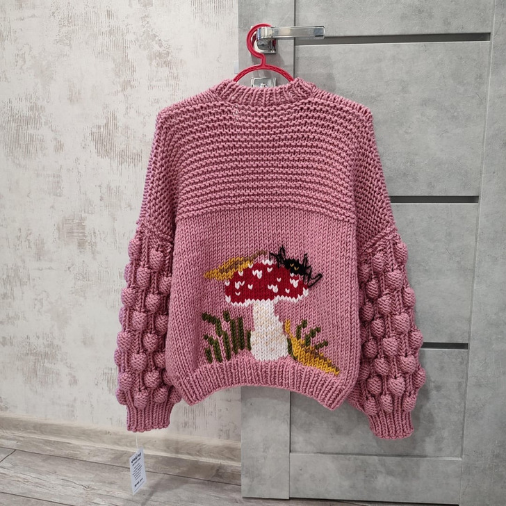 12. “I knitted this cardigan with bubble sleeves and a mushroom embroidery on the back.”