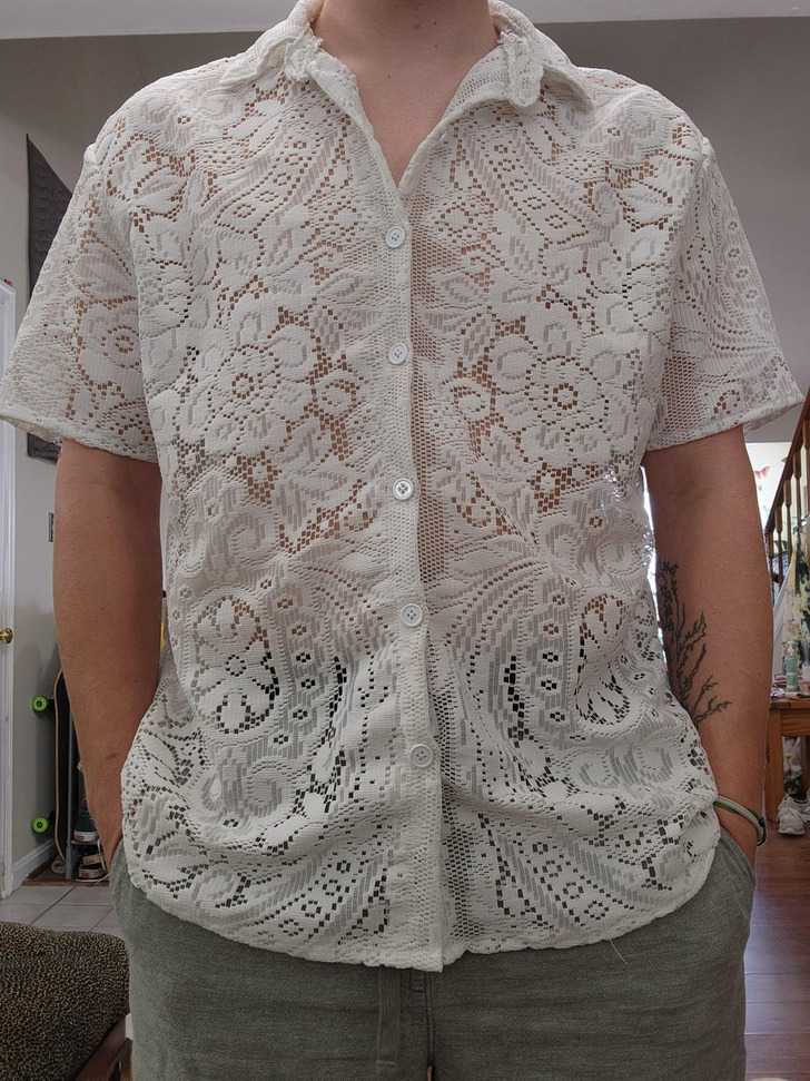16. “Old lace curtain to button up shirt.”