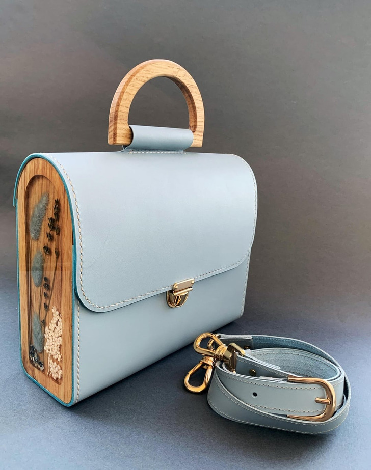 13. “A leather bag with wooden inserts that I made.”