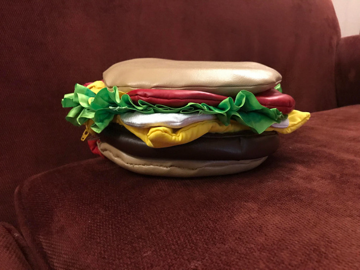 3. “I made a cheeseburger purse. Burger, cheese, lettuce, tomatoes, and onions are all different sections of the purse with their zippers. When my kids ask me where the keys are, I usually say, ’Try the lettuce.’”