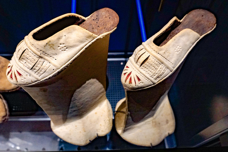 Chopines were usually made from wood or cork and covered with luxurious materials like leather, brocade, or jewel-embroidered velvet, sometimes matching the wearer’s outfit. Wearing them could be tricky; some women needed two servants to walk safely, though experienced wearers could move gracefully and even dance.