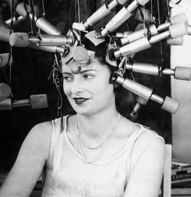 A German hairdresser created a bulky machine for getting elegant curls. A group of curlers was connected to the machine, which heated up the cylinders with the help of an electric current. Sodium hydroxide was applied to the hair, and it would take several hours to finally get nice curls.
