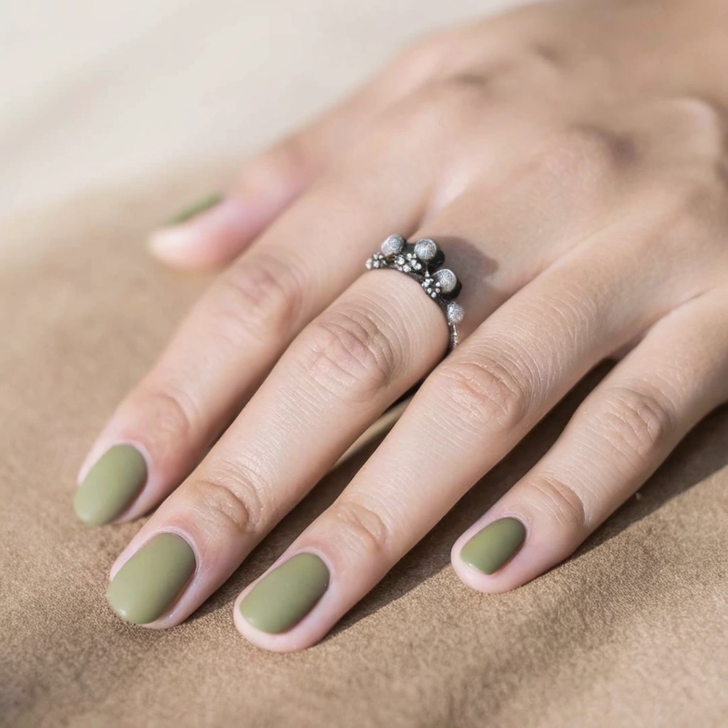 Olive nails can fall flat if kept too simple. The muted green shade perfectly matches autumn coats and accessories, but to make it trend-forward, pair it with abstract gold foil, negative space, or glossy chrome accents. That way, your manicure goes from “just green” to editorial-level chic.