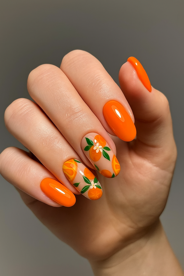 This vibrant orange manicure with hand-painted citrus and floral details is the ultimate autumn nail idea. The glossy finish makes the design pop, while the playful fruit art keeps it fresh and trendy. To make it even better, you can add a matte top coat for a chic twist or sprinkle in subtle gold foil accents for extra sparkle.