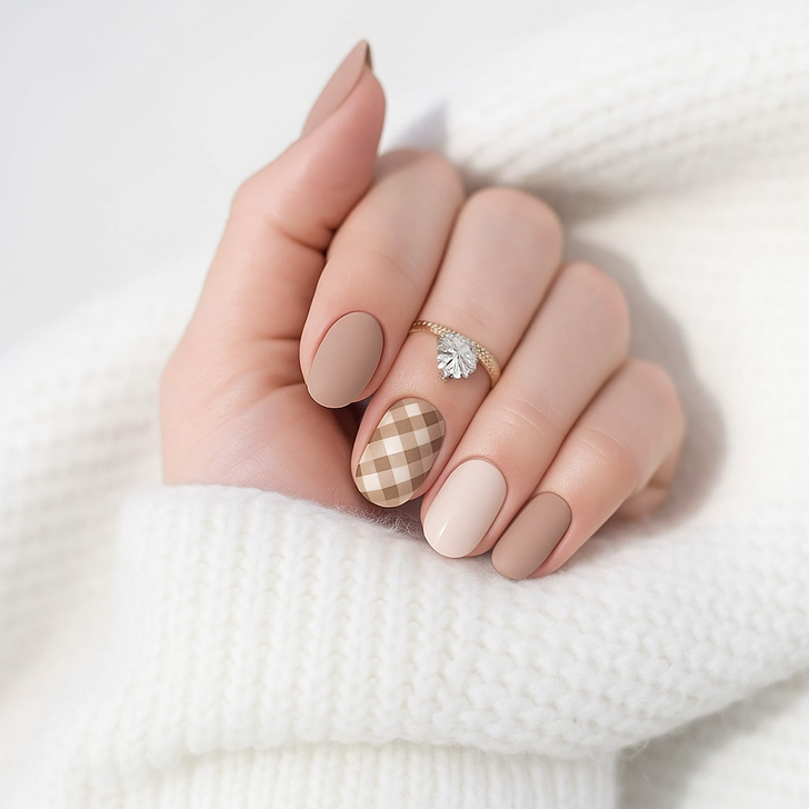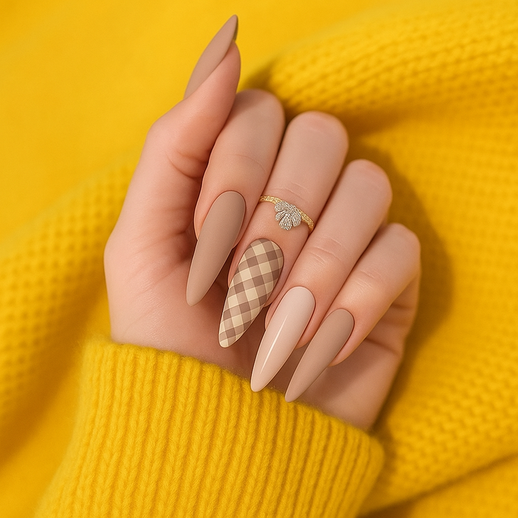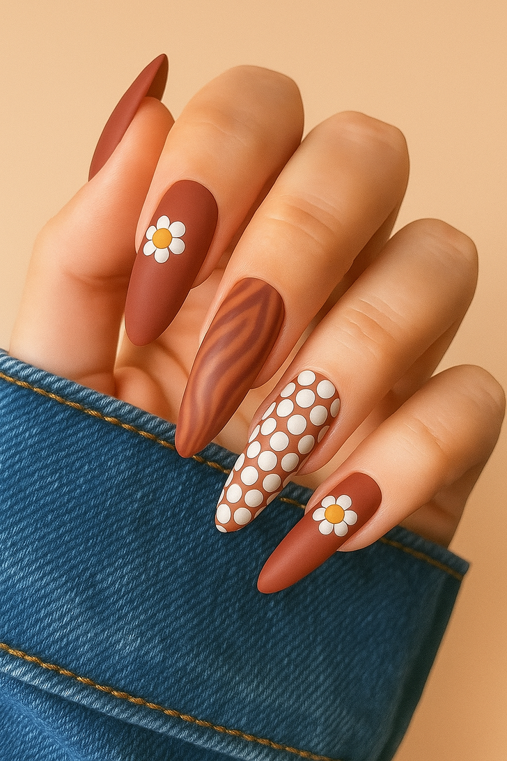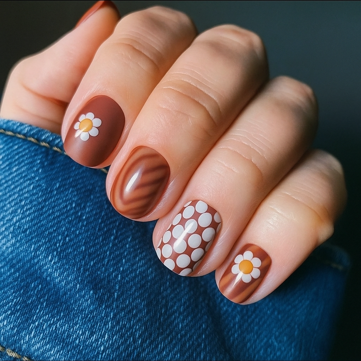 Brown swirls, checkerboards, and daisy prints had their moment, but this retro-inspired manicure feels stuck in last year’s trend cycle. While the neutral palette is great for autumn, the mix of patterns makes it look less polished.