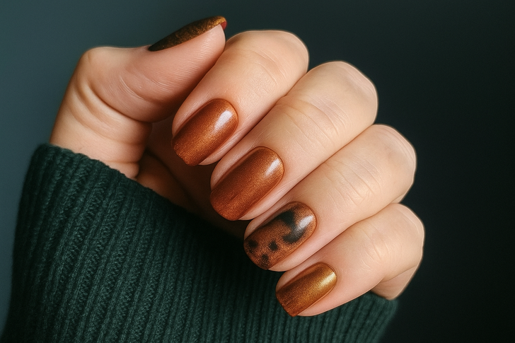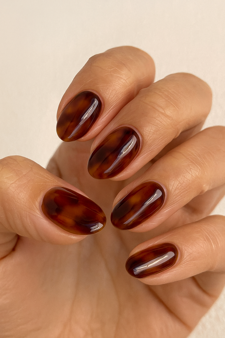 Tortoiseshell nails are the ultimate it-girl manicure for fall 2025. They’re chic, glossy, and versatile enough to go from office meetings to weekend brunch. The rich blend of caramel and chocolate tones gives major cozy sweater vibes. To make this look even better, add a subtle gold foil accent on one or two nails for that extra luxe detail.