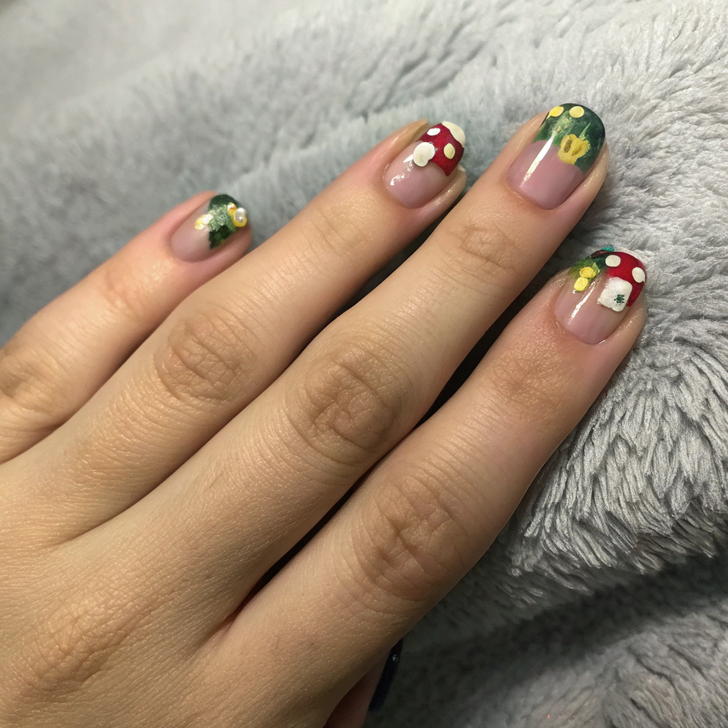 Think soft neutral bases with earthy red, tan, or cream accents inspired by toadstools and forest vibes. The whimsical detail gives your manicure a cottagecore edge while still feeling seasonal and fresh. To make it even better, add tiny hand-painted mushrooms, speckled details, or a glossy top coat that mimics the shine of dew-covered fungi. It’s playful, unexpected, and very “fall forest chic.”