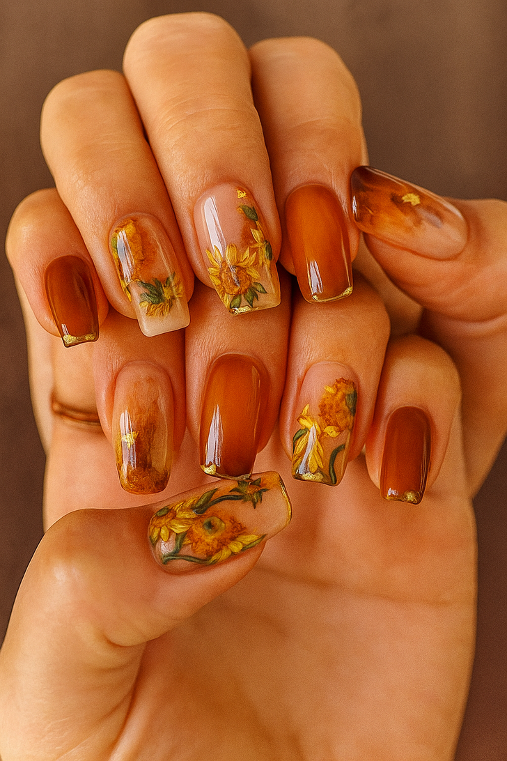 Sunflower nails are the perfect autumn manicure idea to try before they get too trendy. The warm amber tones mixed with delicate floral details capture the essence of fall while still looking modern and fresh.