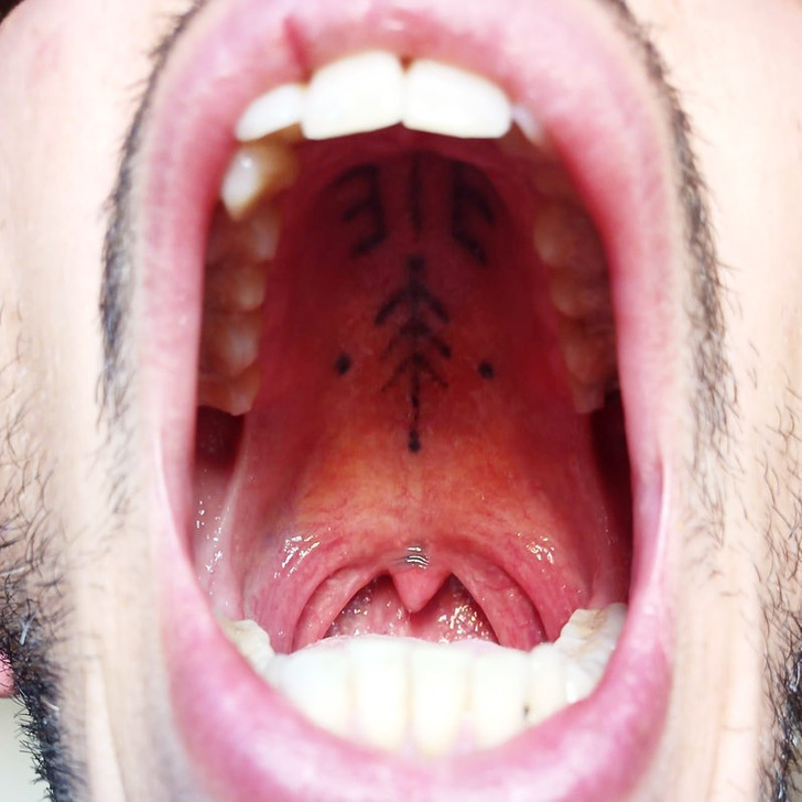 Voet became famous for designing mouth-roof tattoos. Contrary to expectations, Voet insists that the client’s experience is not as daunting as one might imagine. He says that nine out of 10 people describe mouth tattoos as almost painless or, at the very least, very easy to handle. The remaining 10% mostly complain about jaw muscle aches, which seems logical.