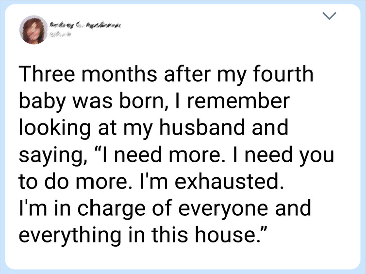Every night we make dinner, and he asks me what he needs to do. Every morning, he drops the kids off at daycare and asks me what to pack. I told him, “I am the manager of this house, and I need you to do more things.”