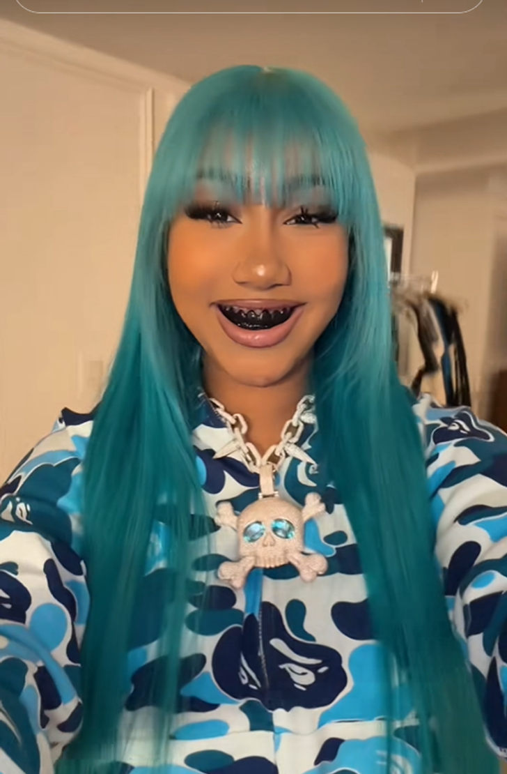 Just recently, North had already caught everyone’s attention with a daring style moment, and now she has once again set the internet buzzing by revealing a surprising new look in a series of TikTok videos. In the clips, North shows off bright blue braided hair, faux face tattoos, blue contact lenses, black grillz, and even a fake nose ring. She completes the outfit with an oversized black T-shirt, loose shorts, chunky sneakers, and layered silver jewelry, creating a bold and eye-catching appearance.
